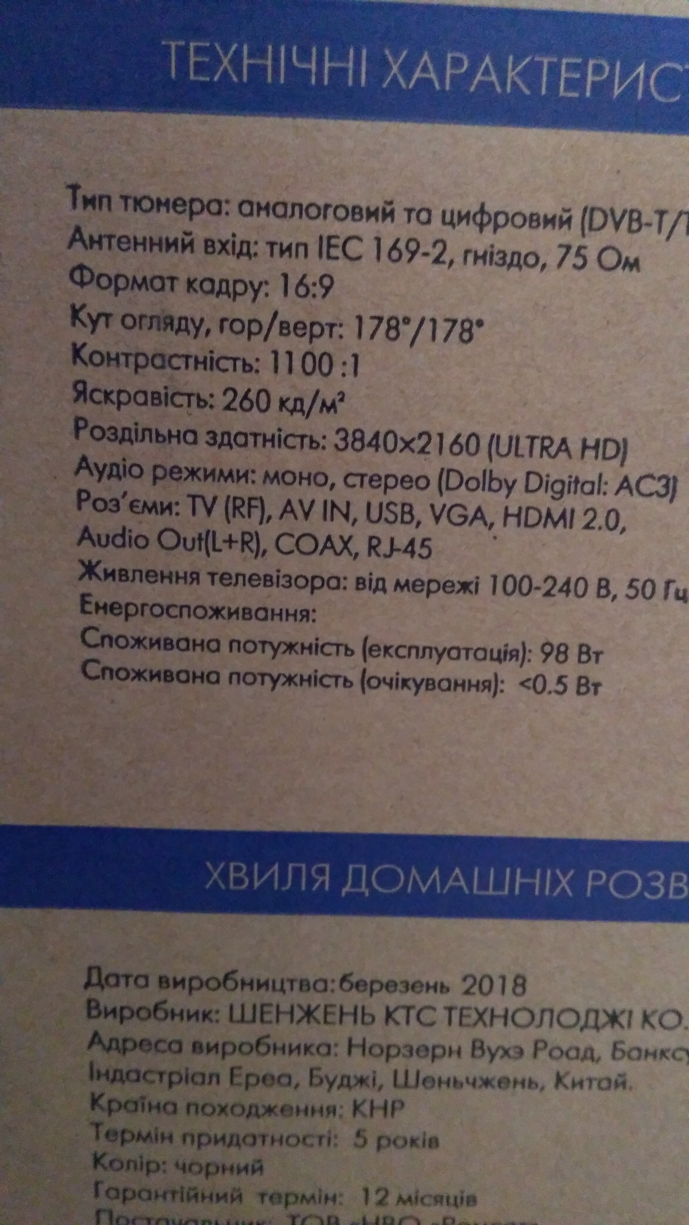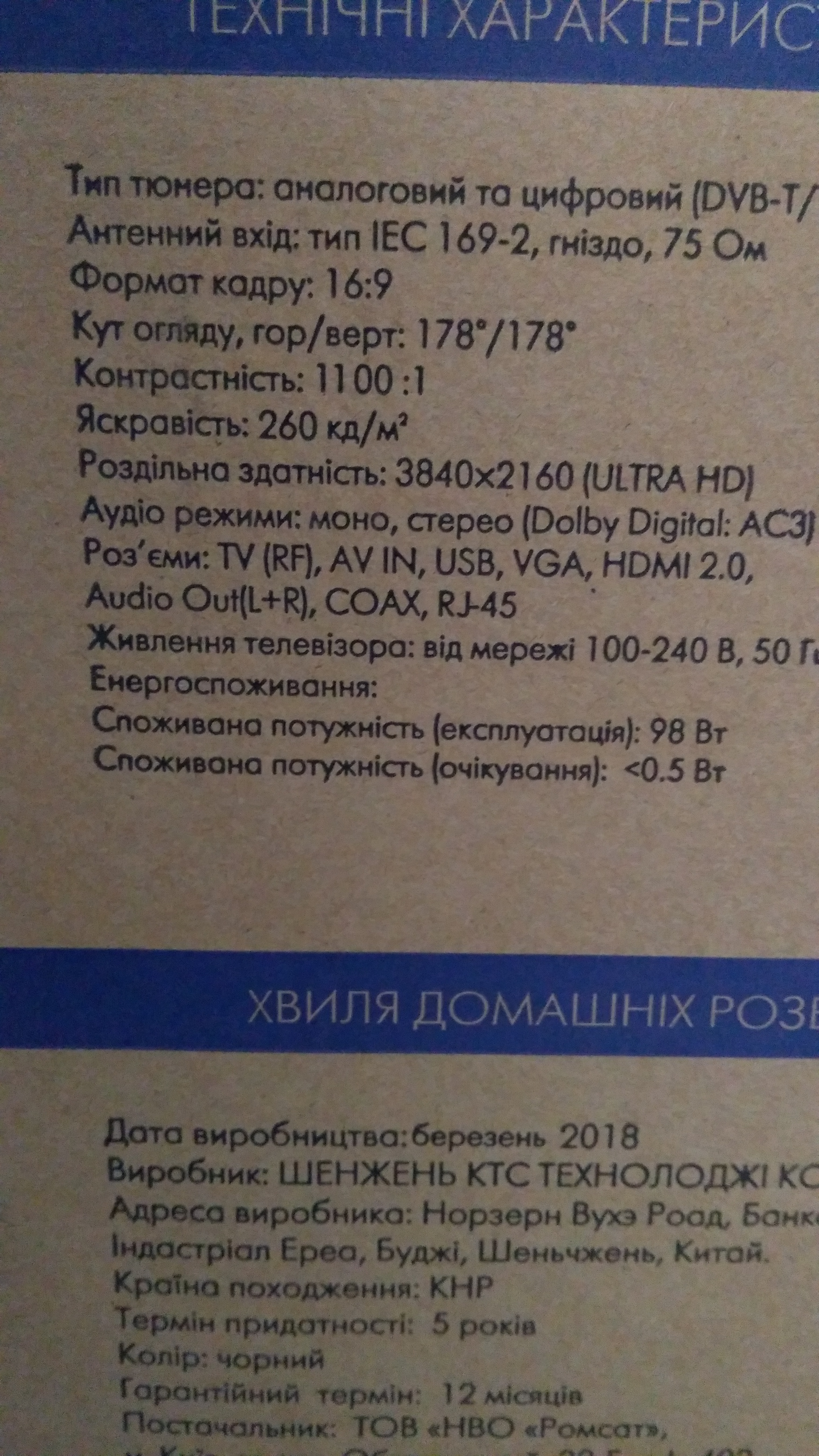 Вы уверены что у вас на коробке те данные, что вы написали? Пришлите фото вашей коробки.alex2020 писав: ↑26 грудня 2018, 21:39 Сегодня почитал что пишется на коробке - контрастность 1100:1 яркость 260 кд/м2. Читаем сайт