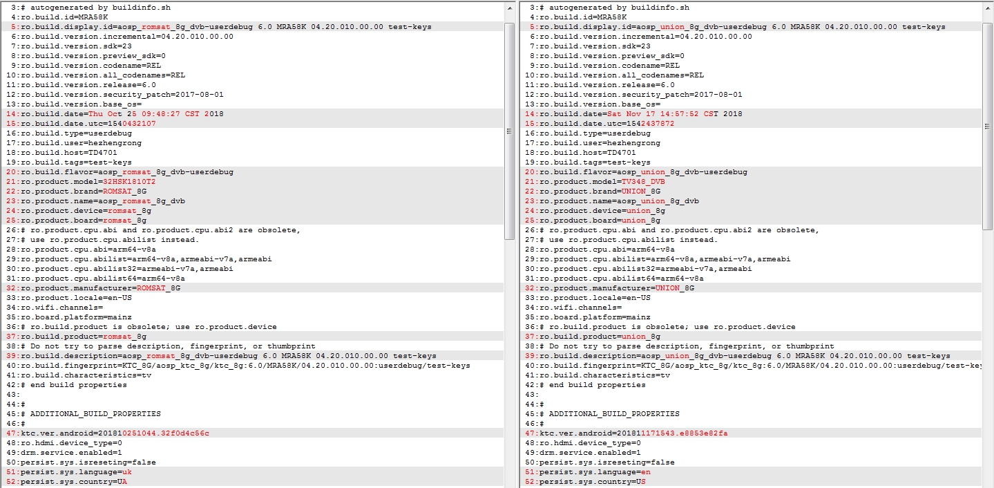 Ось порівняння build.prop з прошивок Romsat та UDtv. Фактично все однакове, окрім назви бренду, дати і регіону.