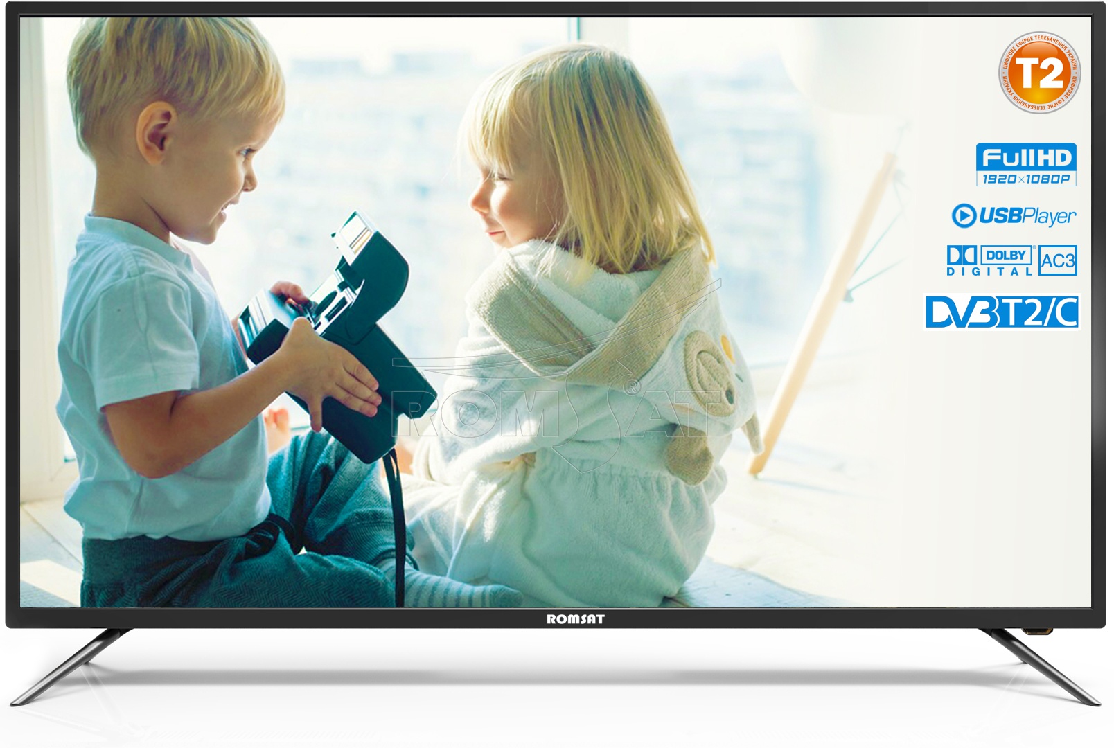 Телевізор Romsat 48FMC1720T2 - представник нового модельного ряду 2018 року. Телевізор має екран здатністю FullHD (1920х1080), аналоговий і цифровий тюнери DVB-T/T2/C, містить вбудований USB-медіаплеєр підтримує кодеки відео MKV і звуку AC3.