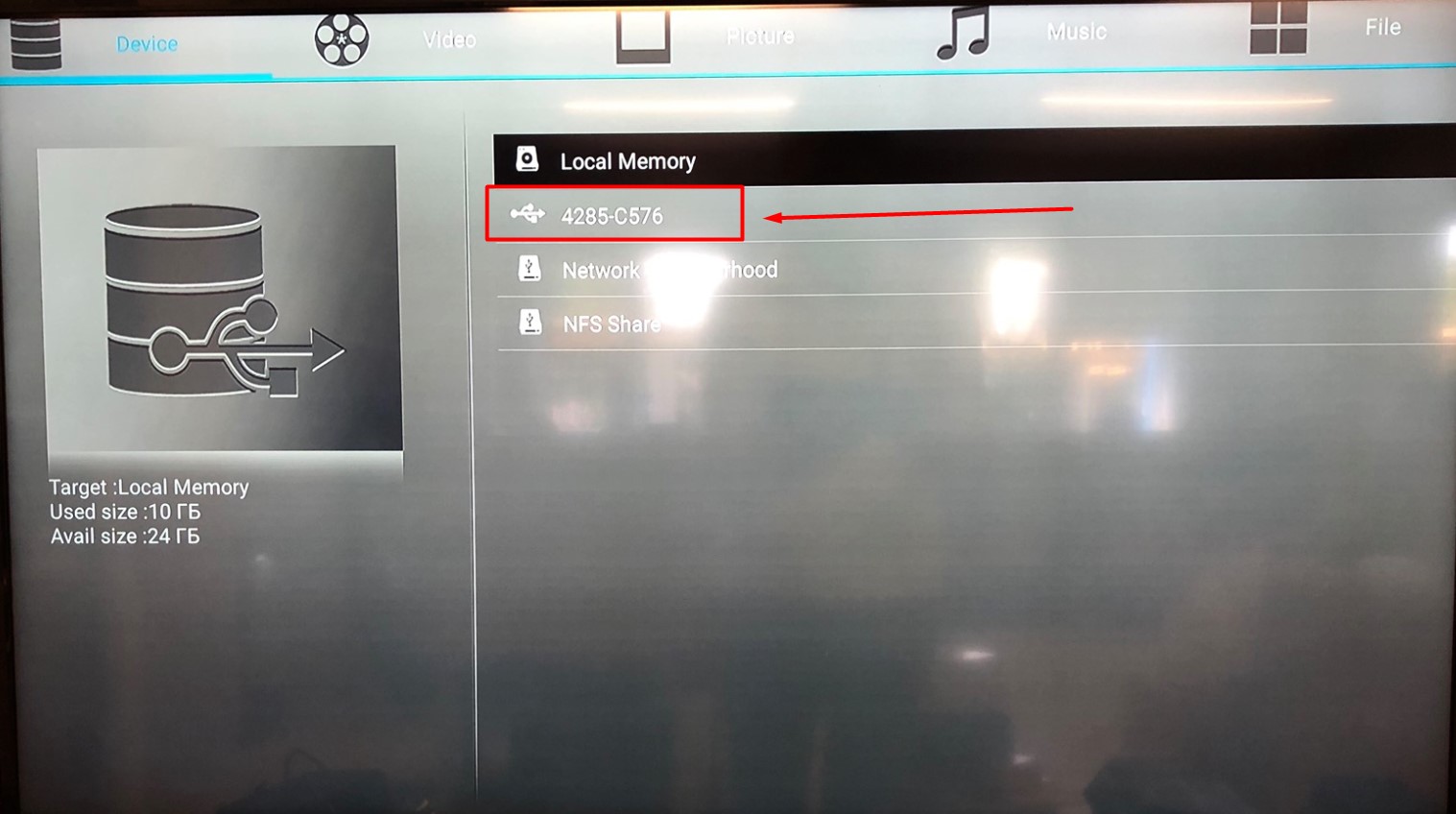 2. Подключаем USB-диск к USB порту медиаплеера