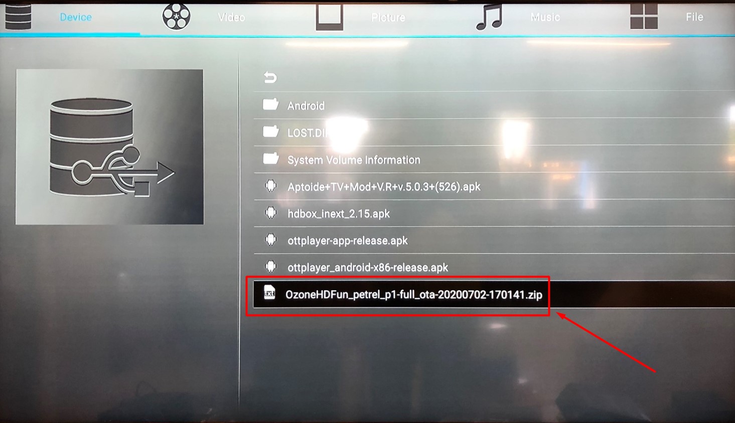 1. Копируем на USB-диск (обязательно должна быть система FAT32) архив OzoneHDFun_petrel_p1-full_ota-20200702-170141.zip